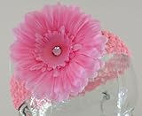 1.5" crochet baby headband. This headband features a 4" silk gerbera daisy that sparkles with an acrylic rhinestone in the center. Recommended ages: Newborn to 4 years old. MANY COLORS AVAILABLE!